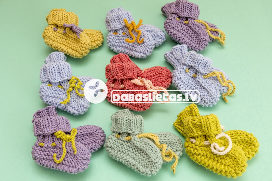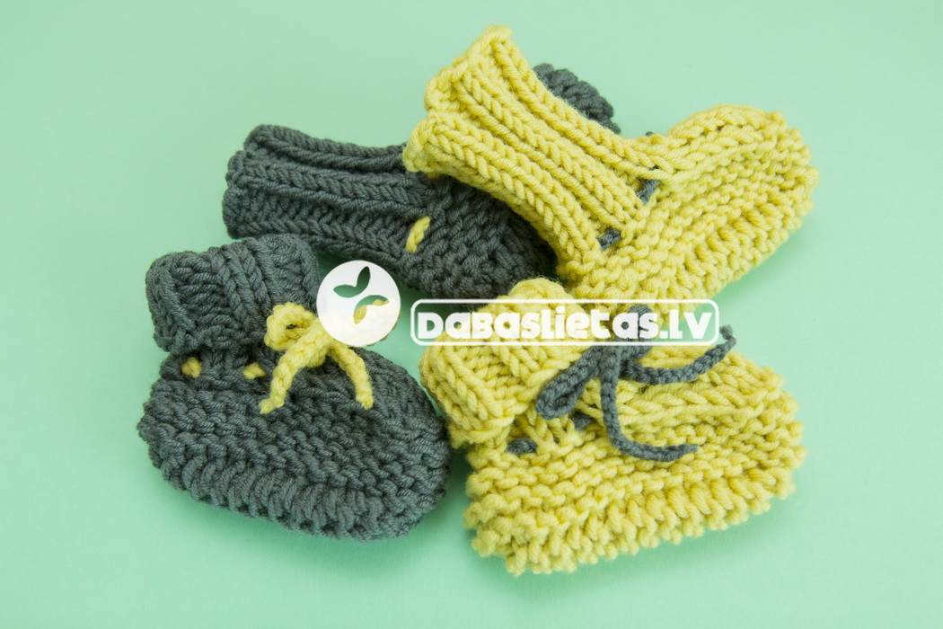 Adīti merino vilnas mazuļu zābaciņi darināti no maigas un siltas merino vilnas dzijas ar sasienamu aukliņu. Stimulē asinsriti uzvilktas uz plikām kājiņām. Izmērs no 0 līdz ~3 mēn., bet derēs arī ilgāk, elastīgas.