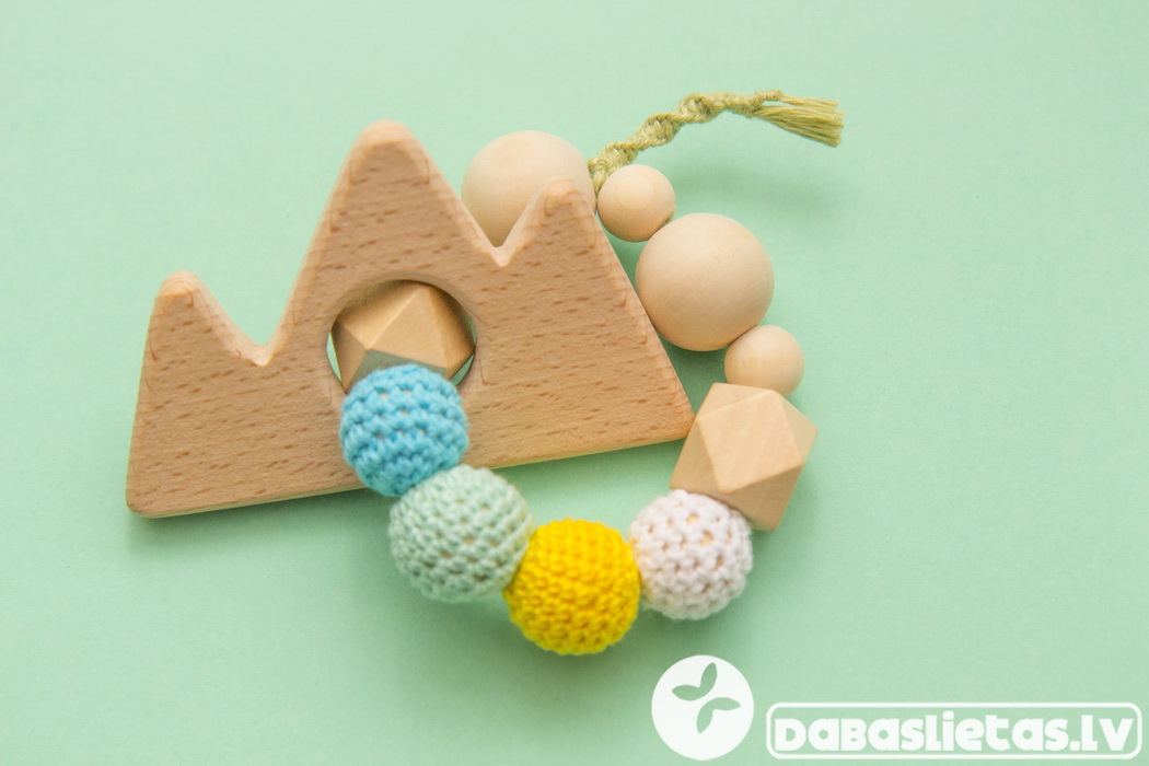 Koka graužamriņķis - grabulis ar koka un aptamborētām dažādas formas bumbiņām un linu pītu aukliņu. Maigi grab, dažādas formas un faktūras koka bumbiņas attīstīs sīko motoriku, kas nozīmē arī valodiņas attīstību.