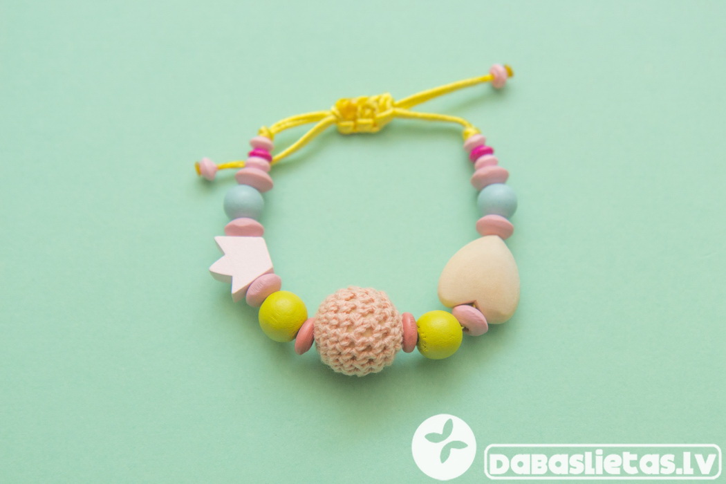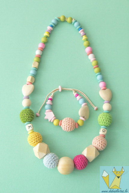 Koka krelles jaunkundzītei personalizētas ar bērniņa iniciāļiem un pieskaņota rokassprādze.