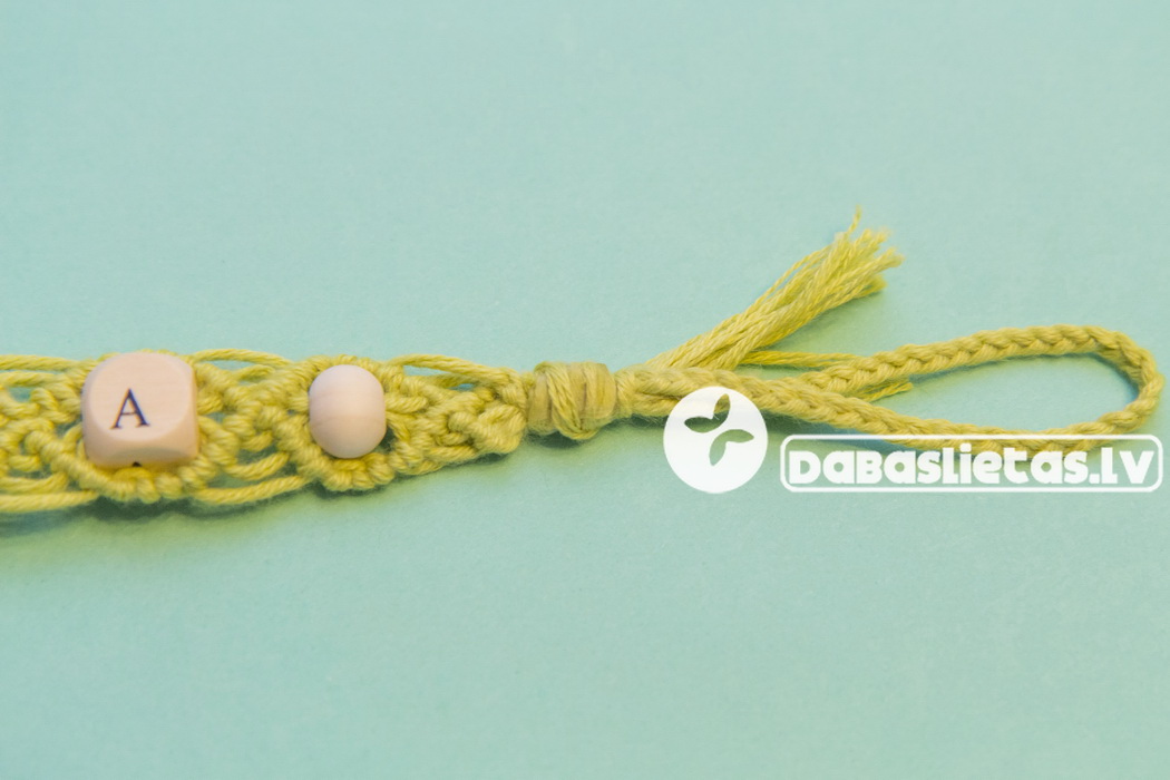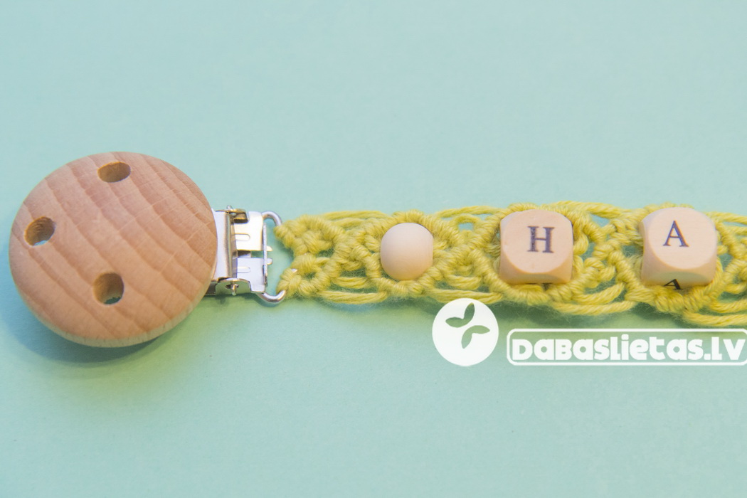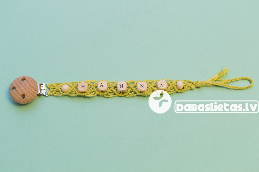 Knupīša turētāja klipsis ir īpaši liels un kvalitatīvs, izgatavots no dižskābarža. Mezglojums no organiskas bērniem domātas kokvilnas dzijas.
