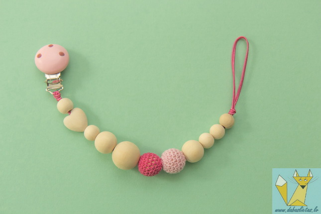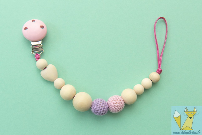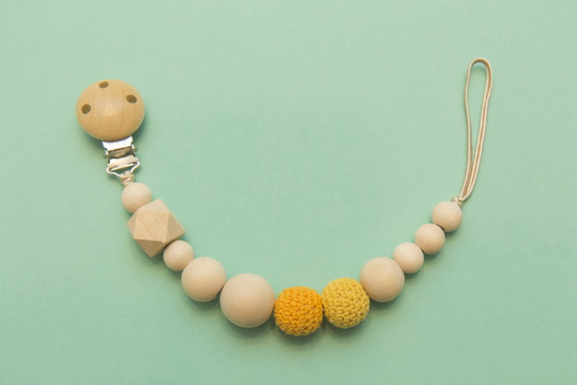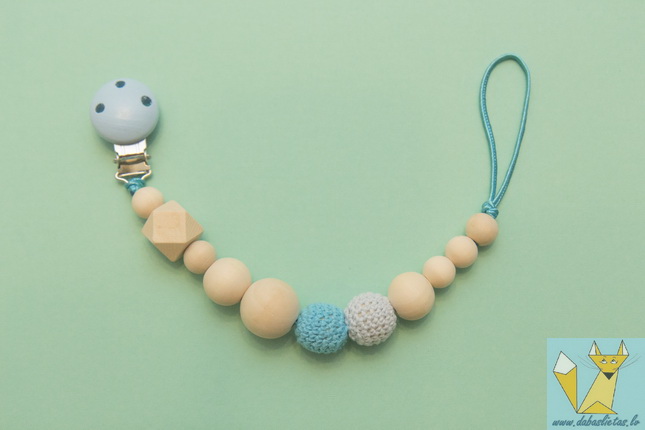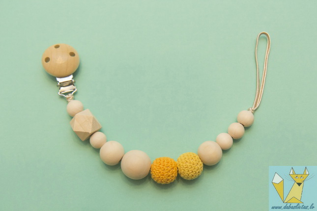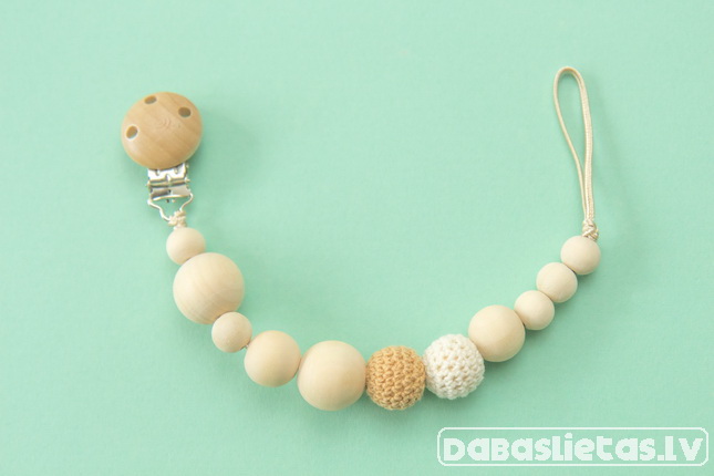 Izgatavots no ekoloģikām kļavas koka pērlītēm, aptamborēts ar kokvilnas diegu. Dažādas formas un faktūras koka bumbiņas attīstīs sīko motoriku, kas nozīmē arī valodiņas attīstību.