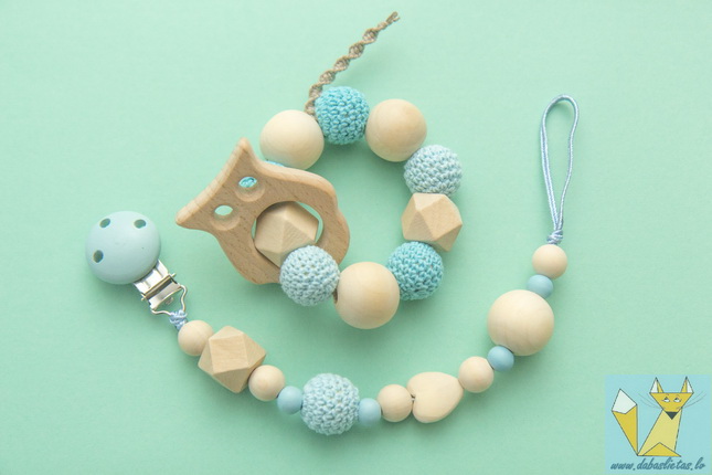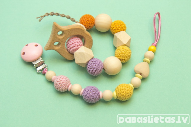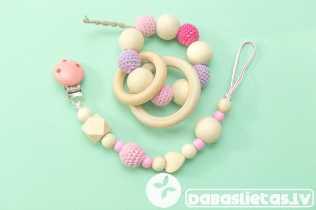 Izgatavots no kļavas koka pērlītēm, aptamborēts ar kokvilnas diegu. Dažādas formas un faktūras koka bumbiņas attīstīs sīko motoriku, kas nozīmē arī valodiņas attīstību.