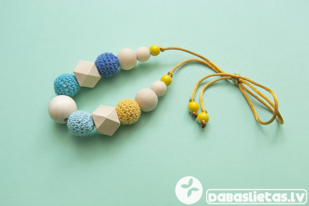 Noderīga lieta mammai barojot bērnu ar krūti, nēsājot slingā, vai apmeklējot veikalu ar mazuli rokās. Bērniņam būs ko izpētīt, pagrauzt un nomierināties mammas klātbūtnē. Dažādas formas un faktūras koka bumbiņas attīstīs sīko motoriku, kas nozīmē arī valodiņas attīstību.