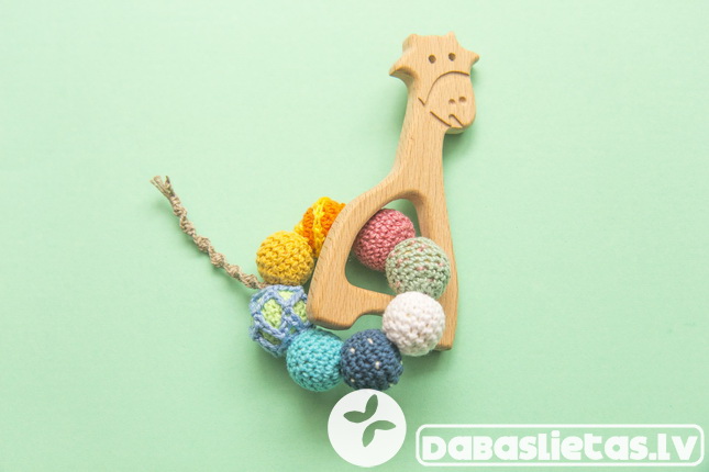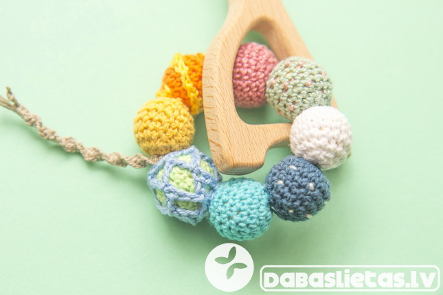 Dabīga rotaļlieta, lieliska alternatīva gumijas, vai silikona graužamām mantām, izgatavota no dabīga koka, bumbiņas aptamborētas ar kokvilnas diegiem, sastiprinātas ar lina pītu aukliņu.